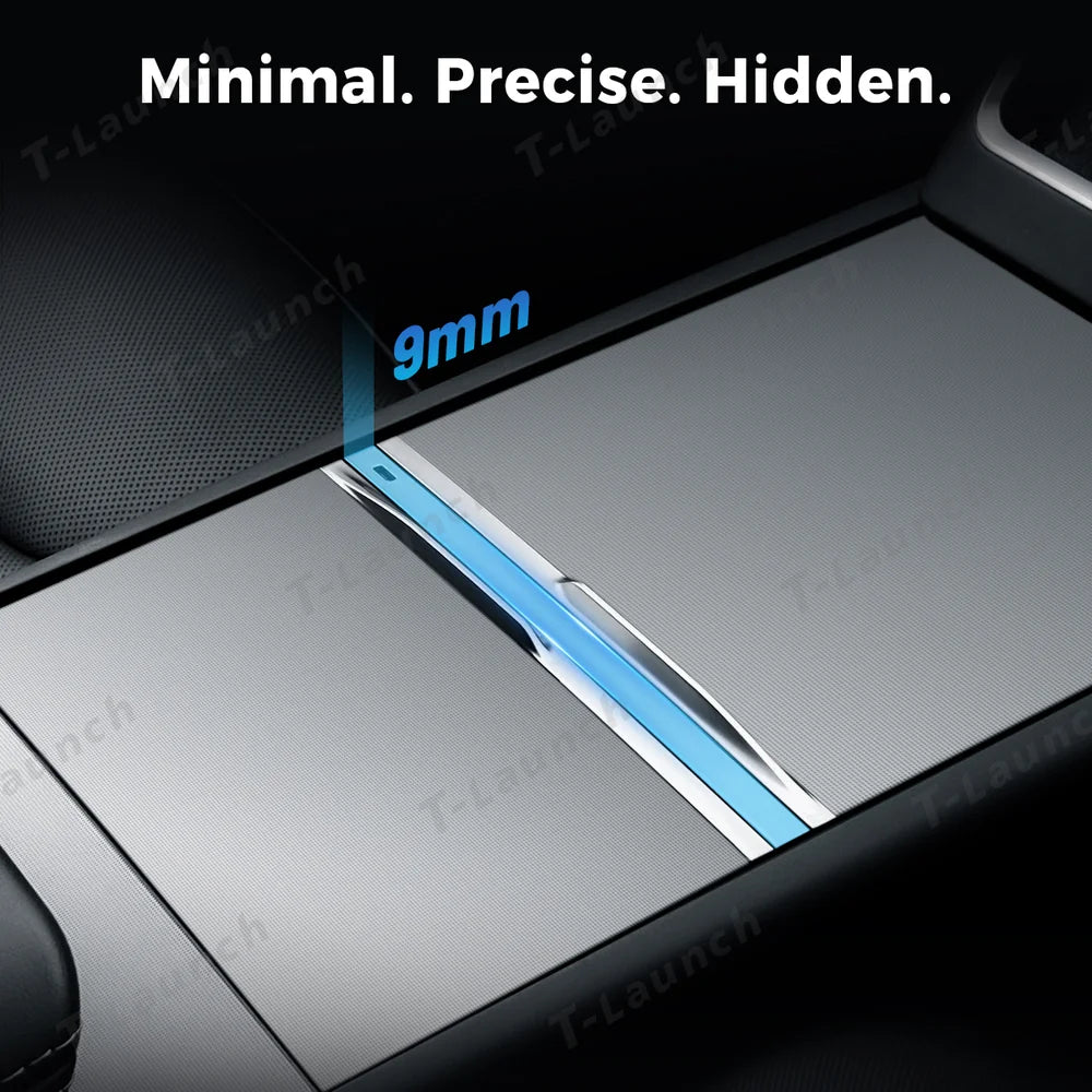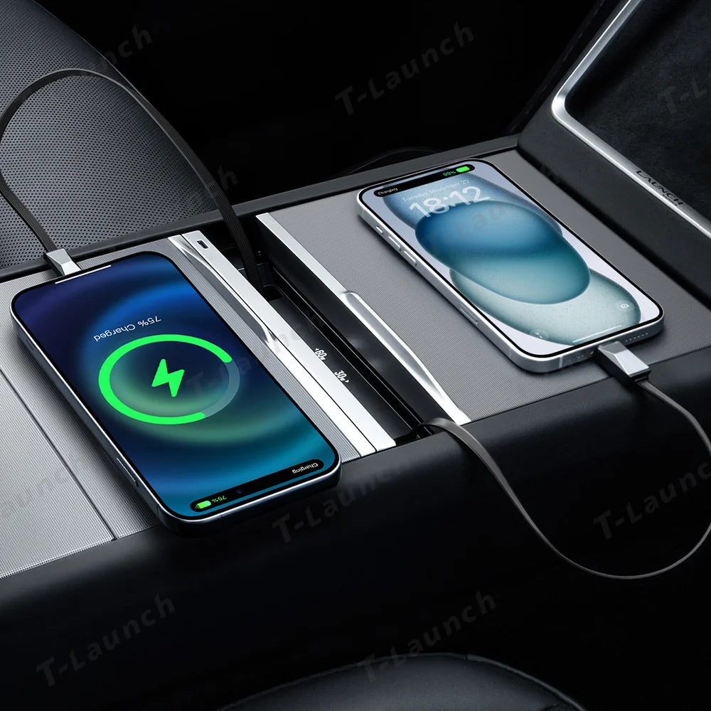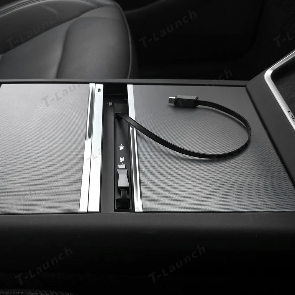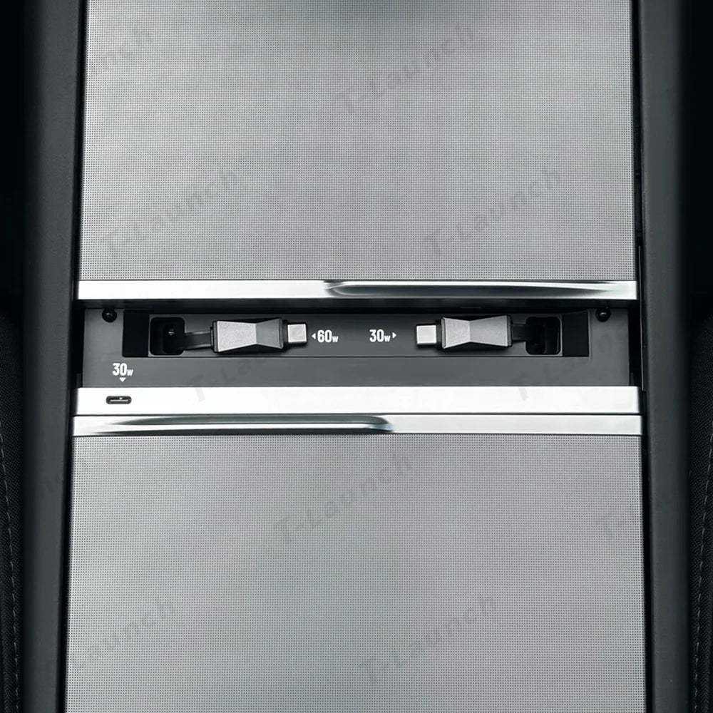Enhance your Tesla Model Y Juniper 2025+ with this GaN-powered center console charging hub. Seamlessly integrated into the console, it keeps your interior tidy while delivering fast and safe charging for your devices, with a subtle LED light for easy operation in low-light conditions. This hub combines efficiency, convenience, and reliability for a superior in-car charging experience.