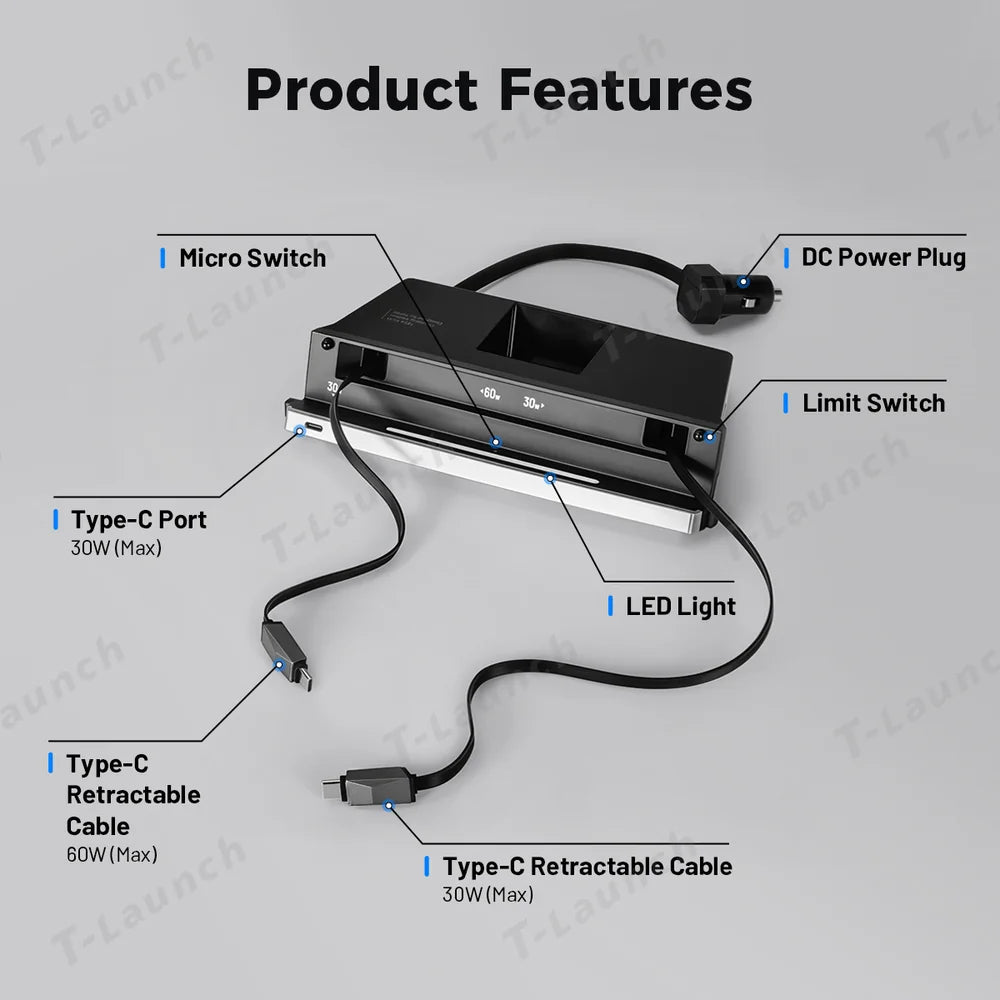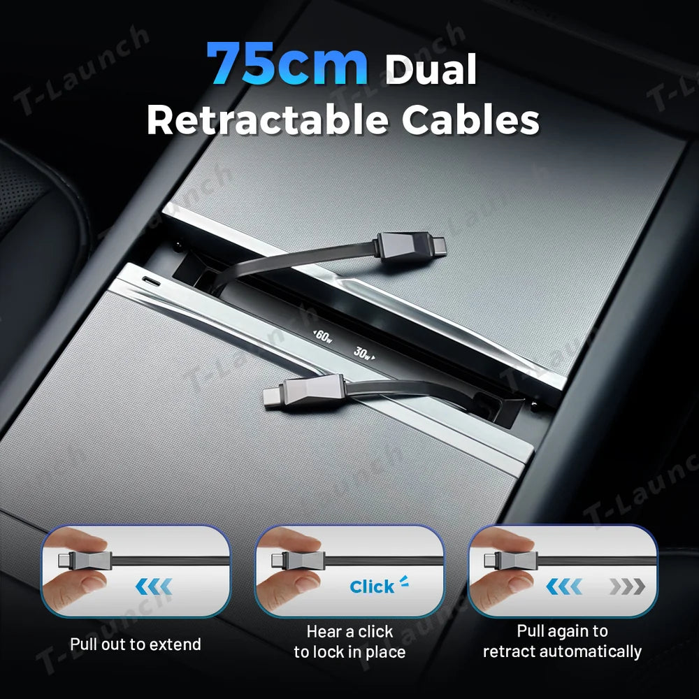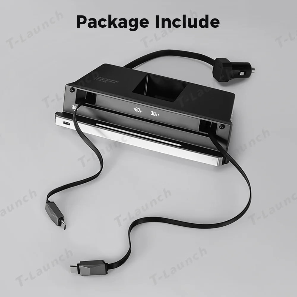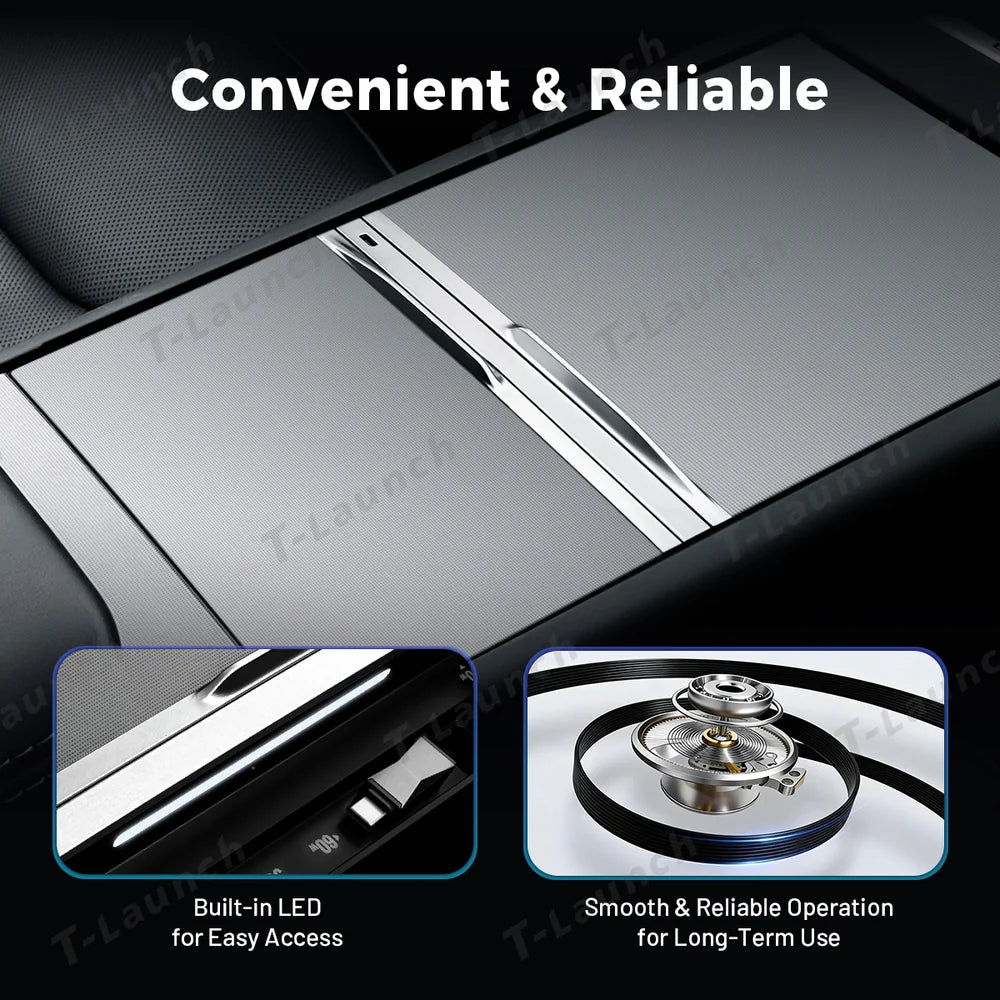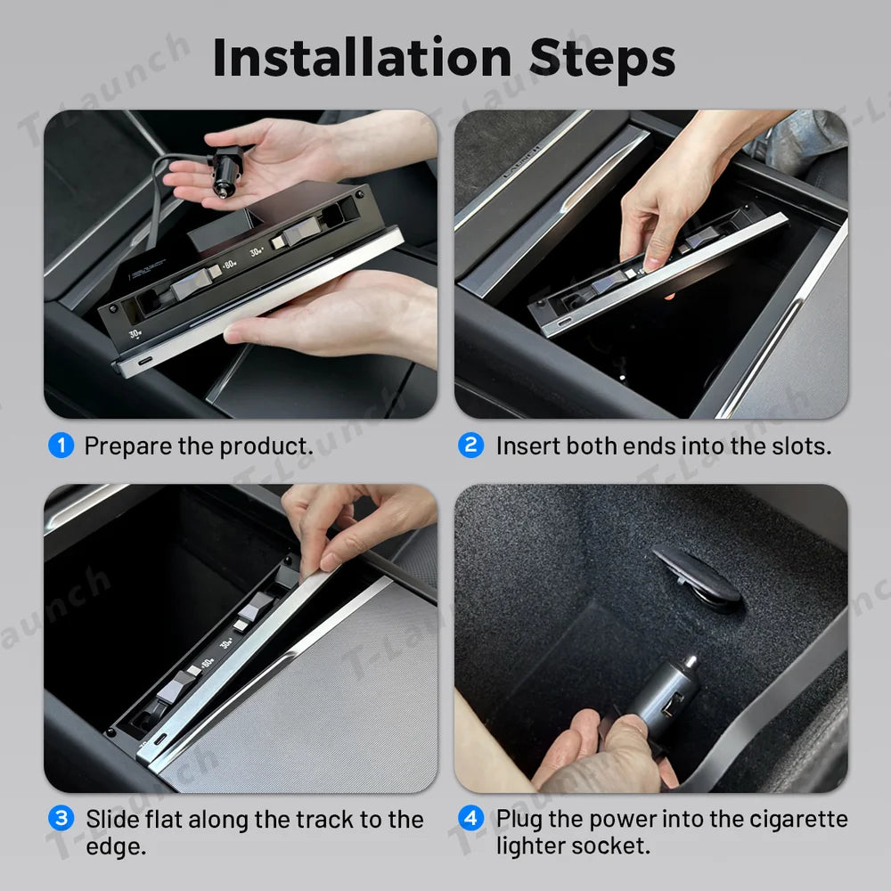 Enhance your Tesla Model Y Juniper 2025+ with this GaN-powered center console charging hub. Seamlessly integrated into the console, it keeps your interior tidy while delivering fast and safe charging for your devices, with a subtle LED light for easy operation in low-light conditions. This hub combines efficiency, convenience, and reliability for a superior in-car charging experience.