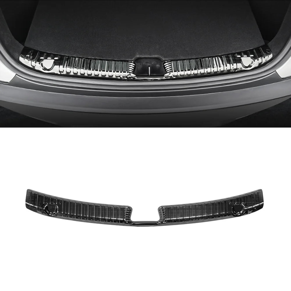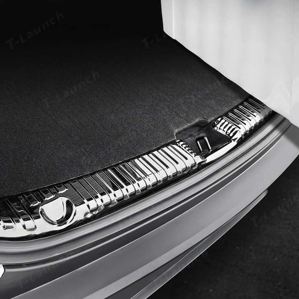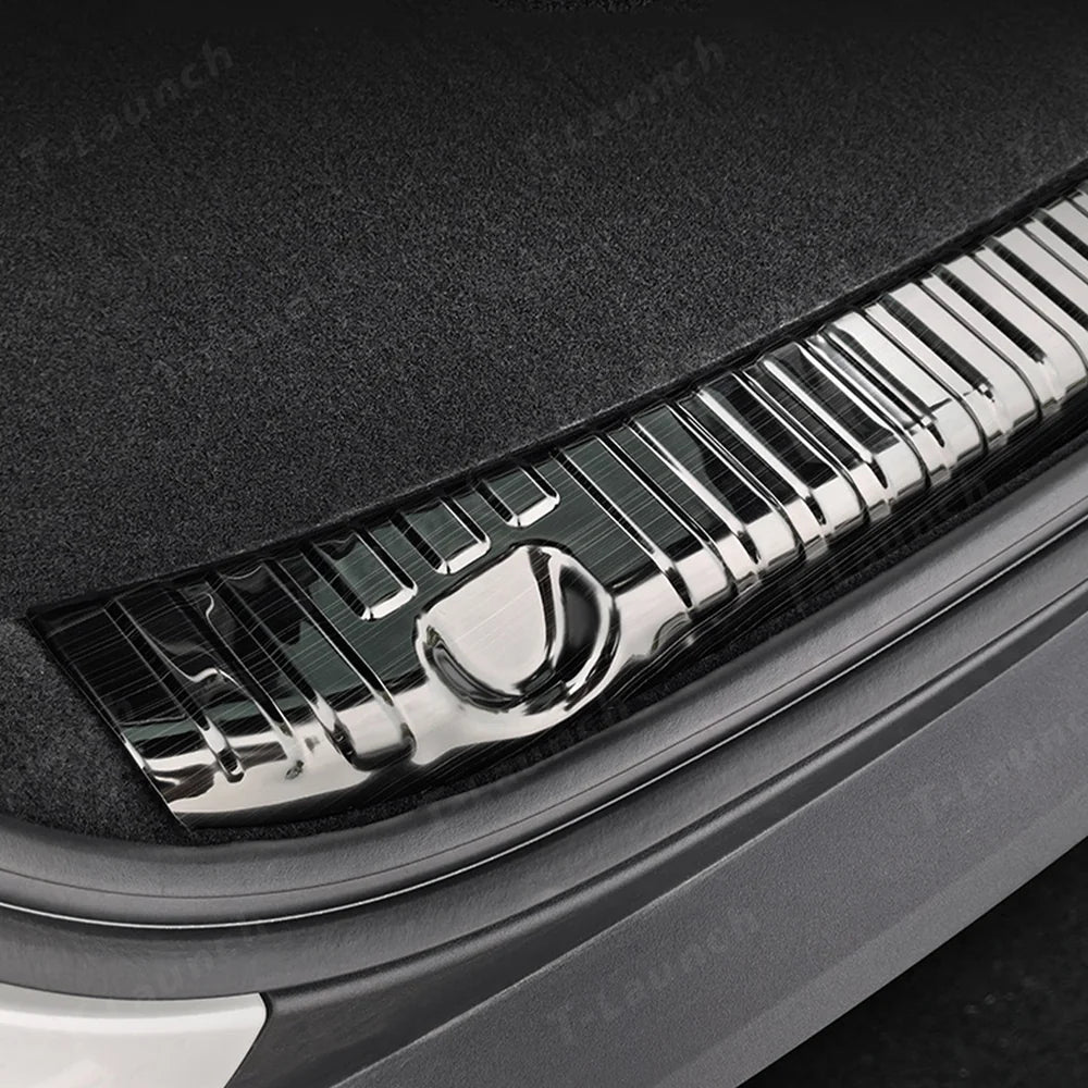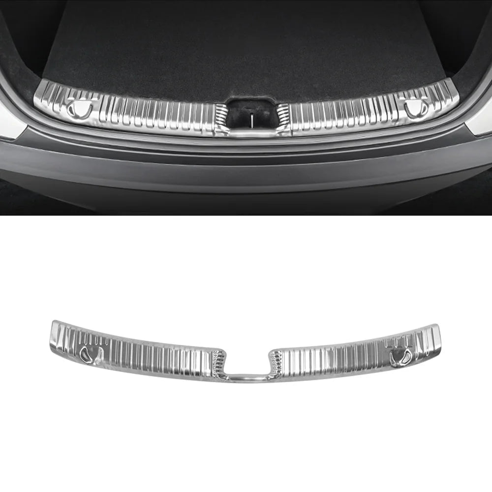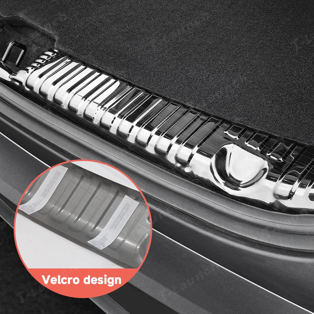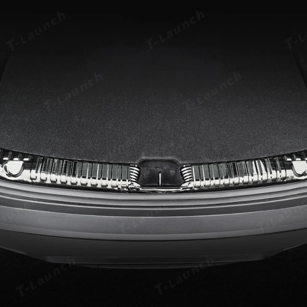 Designed for everyday trunk use, this stainless steel sill protector keeps your Model Y's trunk entry clean and unmarked. Its solid brushed finish complements the interior while preventing scratches during loading. The Velcro-backed design attaches securely to Tesla's soft-fabric trunk lining — no glue, no damage — providing reliable protection with seamless, factory-style integration.