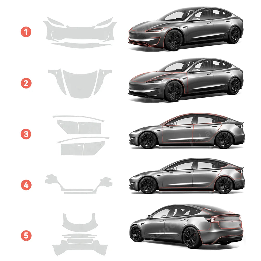 Specially designed for the Tesla Model 3 Highland Performance 2024+, this invisible full-body paint protection film (PPF) is made from advanced TPU material to provide seamless coverage and lasting durability. Engineered for a precision fit, it conforms perfectly to the Model 3's sleek lines, shielding the paint from scratches, chips, and UV damage—while remaining virtually invisible. Thanks to self-healing technology and easy installation, the film helps maintain a pristine, showroom-quality finish for years to come.