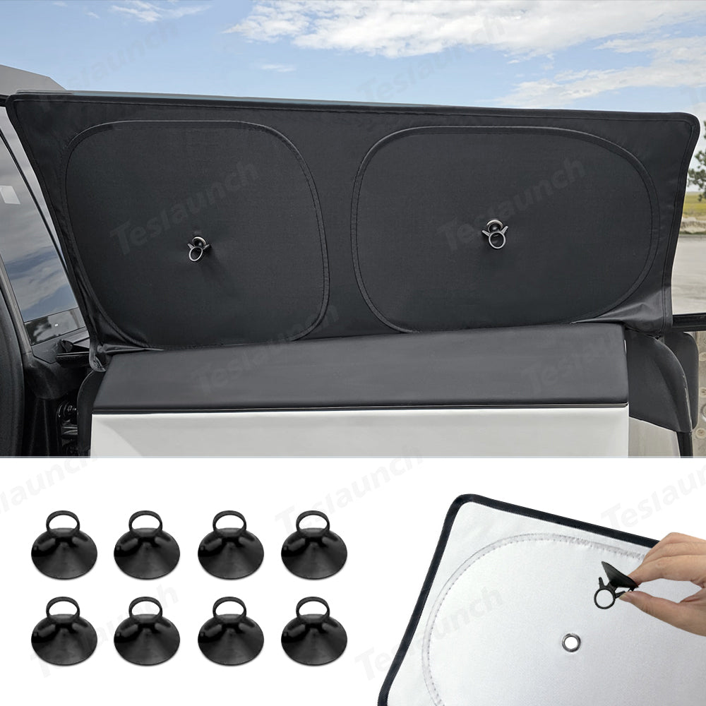 Le nostre tende parasole da campeggio per finestre con isolamento termico e privacy sono progettate specificamente per Tesla Cybertruck. Progettati per bloccare due terzi del calore solare, questi parasole riducono significativamente la temperatura interna, garantendo un ambiente confortevole durante il campeggio o il parcheggio. Realizzati in tessuto nero ad alta densità con rivestimento riflettente in argento, proteggono efficacemente dai dannosi raggi UV, offrendo al contempo un effetto oscurante ideale per la privacy durante le vostre avventure all'aria aperta.