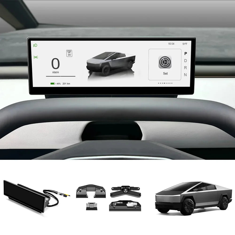 This bundle features the upgraded 3.0 Rotating Screen Mount and 10.88" Multi-Functional Dashboard Display for Cybertruck. The mount restores near-original screen height with smooth 40° rotation, while the display wirelessly supports CarPlay, Android Auto, AirPlay, Miracast, and Huawei HiCar, putting navigation, entertainment, and vehicle data all within easy reach—making every drive smarter, safer, and more comfortable.