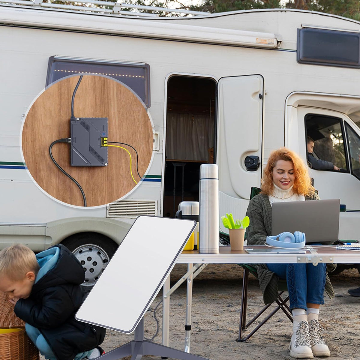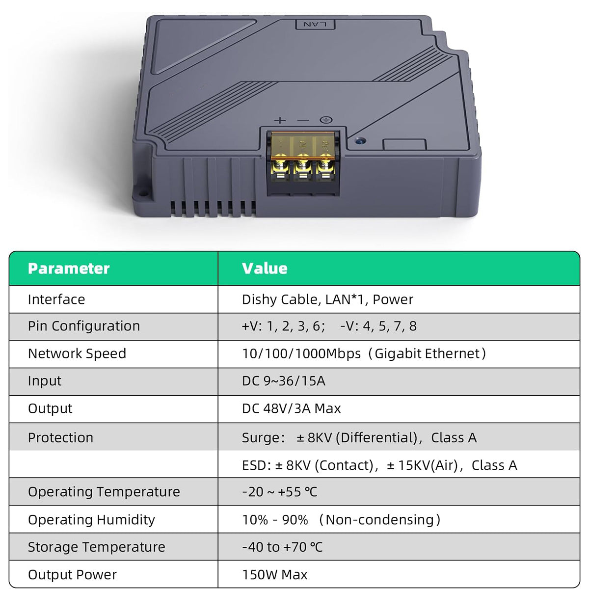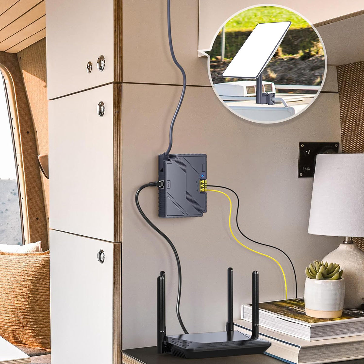 The 3-in-1 PoE Injector with 9- 36V DC Step-Up Converter for Starlink Gen 2 is a compact and efficient solution that integrates a PoE injector, DC step-up converter, and power supply into a single device. Designed specifically for Starlink Gen 2, this injector eliminates the need for multiple components, streamlining installation and saving space. Passive PoE support, built-in ESD protection, and Gigabit Ethernet (10/100/1000M) compatibility ensure stable power delivery, high-speed data transmission, and reliable network performance.