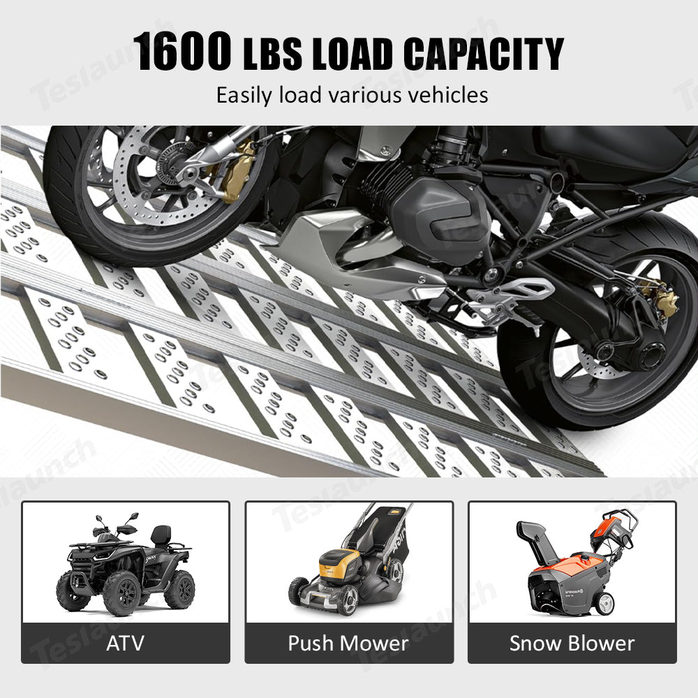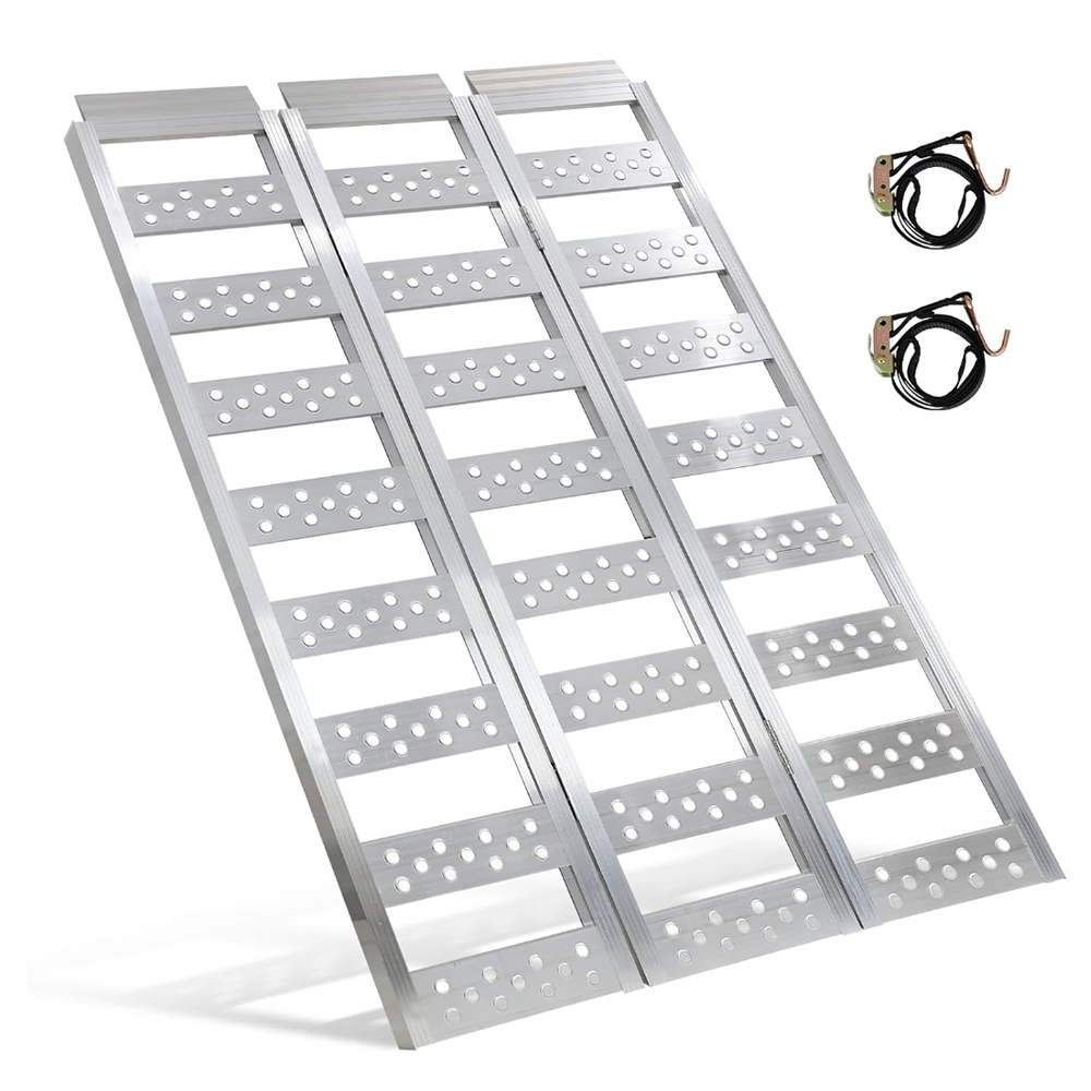Oppdag den perfekte balansen mellom styrke og bærbarhet med våre brede trefoldbare ramper i aluminium. Disse rampene er laget av høykvalitets aluminiumslegering og veier bare 28 pund, men har en imponerende 1600 lbs bæreevne. Ideell for transport av ATV-er, UTV-er og motorsykler, deres unike trifold-design gjør det enkelt å folde sammen til en kompakt størrelse på 69" x 15", noe som gjør lagring og transport enkel.