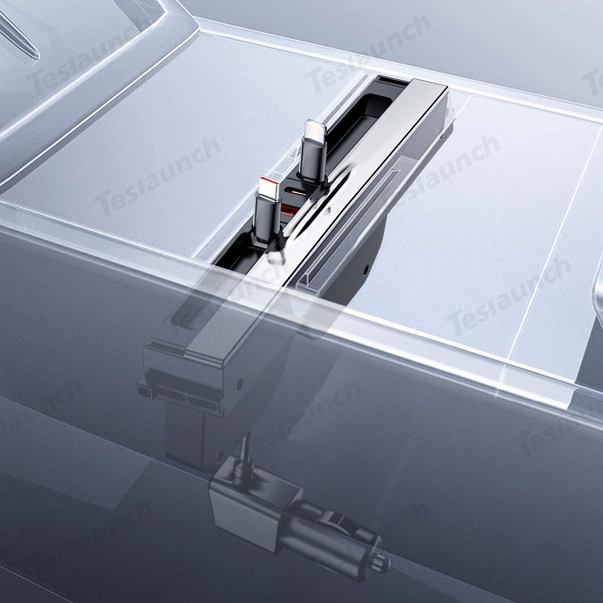 Upgrade your Tesla's interior with the Center Console USB Hub for Tesla Model Y Juniper 2025+ / Model 3 Highland 2024+. Designed with a flush-fit matte finish and crafted to match the factory console with 1:1 precision, this sleek hub transforms a single cigarette lighter port into a powerful charging station. Featuring 65W PD fast charging, dual USB ports, and two retractable 800mm cables, it supports multiple devices at once—without clutter. Slide it in, plug it in, and enjoy seamless charging across both front and rear seats.
