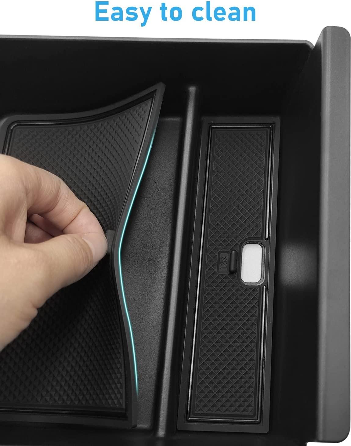 • High Quality: Model S & Model X console tray is made of solid ABS material, with thickened edges that are not easy to break. The glossy finish of the drawer surface perfectly matches Tesla interiors. Our center console storage boxes come with two silicone pads at the bottom to prevent keys, cards, chargers, and other miscellaneous items from sliding around and making noise when they collide with the box.
