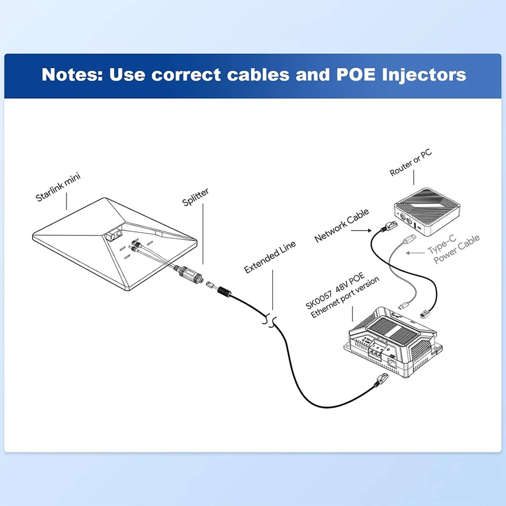 The 150W Gigabit Passive PoE Injector & Splitter Adapter for Starlink Mini provides powerful, stable connectivity in any environment. Its patented all-weather soldered RJ45 connector and –20°C to +70°C operating range ensure long-lasting durability. With a DC 9–36V to 48V/3A boost, it delivers a full 150W output while maintaining smooth Gigabit data transmission for uninterrupted streaming and fast downloads. Designed for the Starlink Mini using the original cable, it prevents port wear and ensures a secure, reliable connection. Built-in USB-A and USB-C outputs let you power routers and accessories, enabling a clean, efficient, and dependable installation wherever you deploy Starlink.