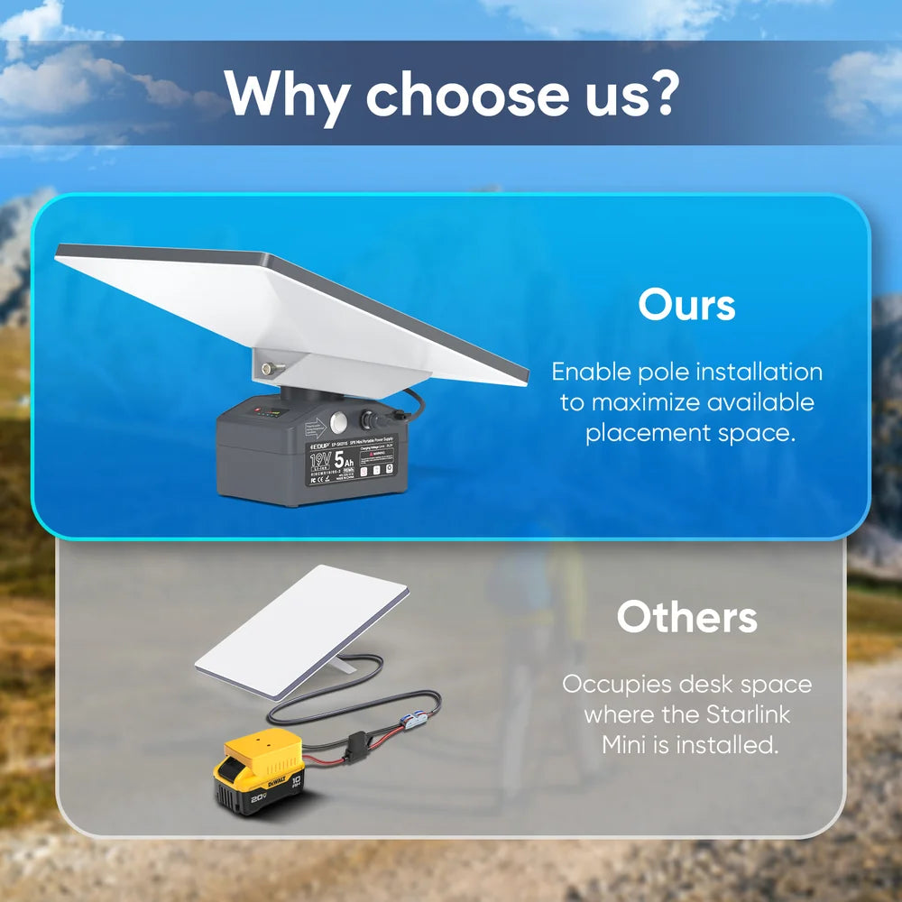 The 19V 95Wh (5Ah) Portable Battery Pack with Pipe Adapter is a compact and reliable power solution designed for Starlink Mini. Weighing approximately 0.85 kg, it is easy to carry and ideal for mobile, outdoor, or backup power use. Built with high-quality components, it delivers stable and efficient power to keep your connection running wherever you go. The included pipe adapter enables flexible mounting, while the durable design ensures safe operation across a wide range of temperatures.