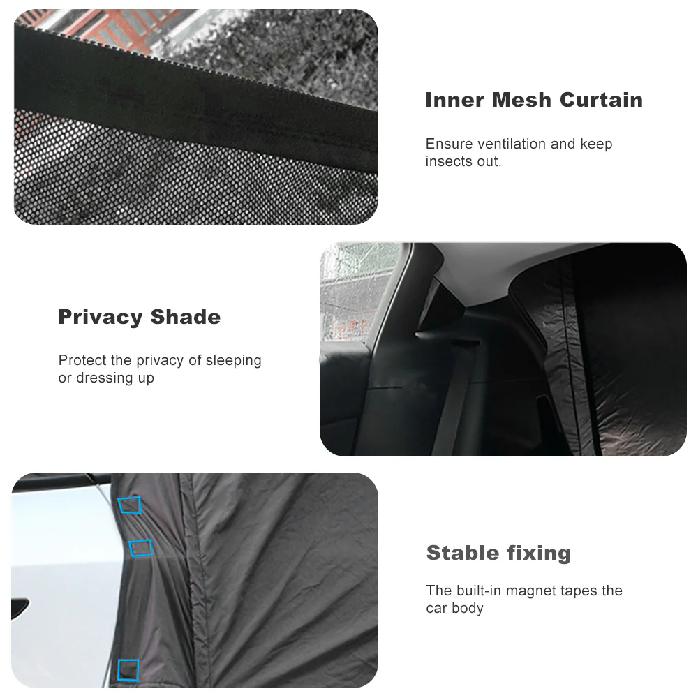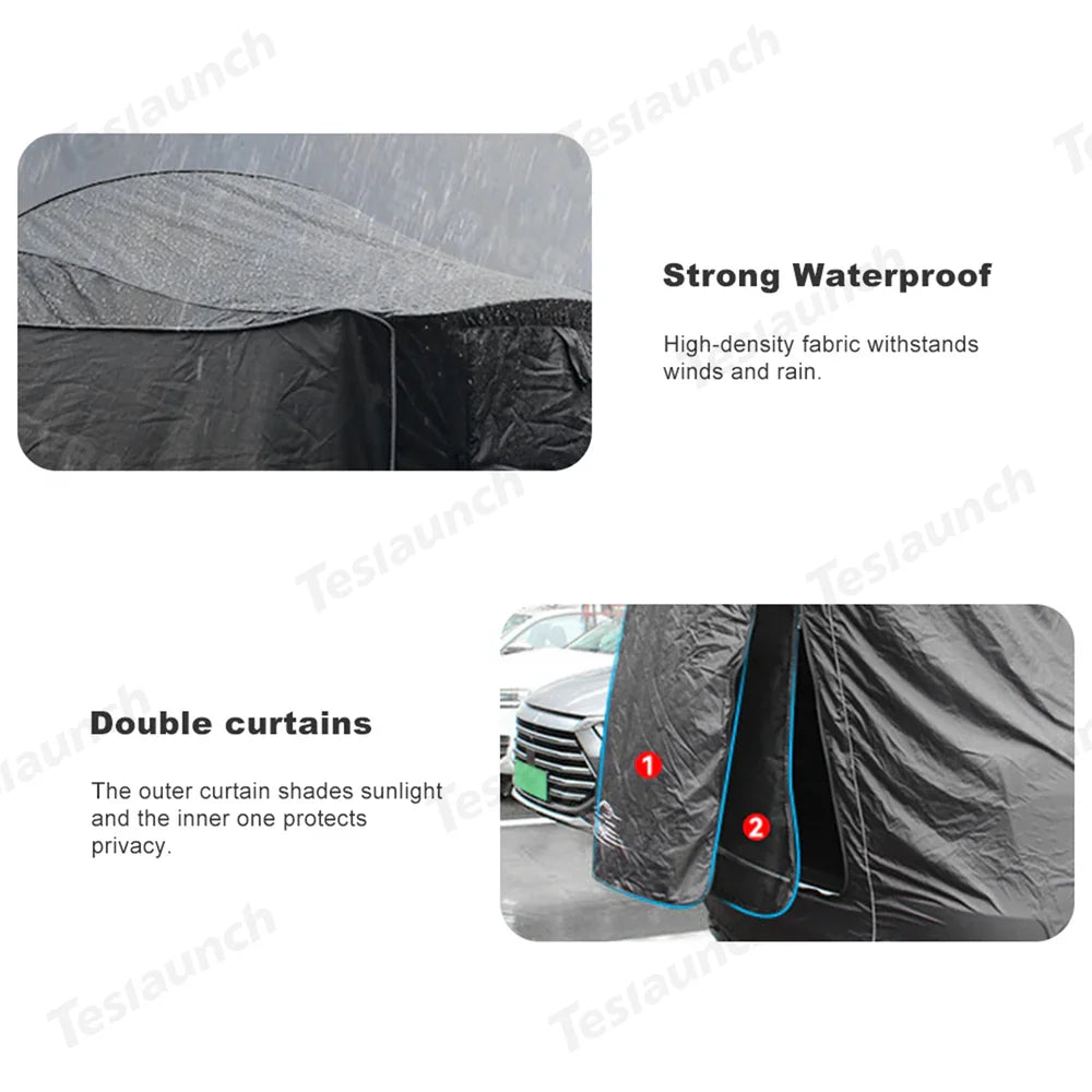 Campingtält Baklucka Utomhus Vattentät Solskydd Avskildhet Skugga Markis för Tesla Model Y. Det är speciellt utformat för modeller från och med 2020. Detta mångsidiga tält ger bekvämlighet och komfort till dina utomhusäventyr, med en dragkedjaöppning för enkel åtkomst och extra takhöjd inuti kabinen.