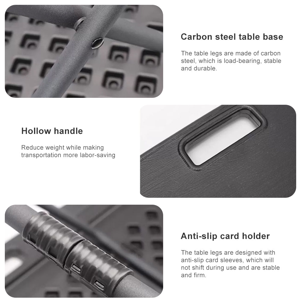 • Hållbar och stabil: Vårt fällbara resebord är tillverkat av högkvalitativa material och garanterar hållbarhet och stabilitet. Dess robusta design tål tuffa utomhusmiljöer och ger en pålitlig yta för en mängd olika aktiviteter.