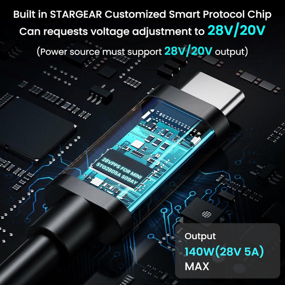 สายไฟ USB-C ถึง DC สำหรับ Starlink Mini มีชิปโปรโตคอลอัจฉริยะ STARGEAR รับประกันความเข้ากันได้อย่างราบรื่นกับแหล่งจ่ายไฟ 28V PPS และ PD 20V ชิปจะปรับแรงดันไฟฟ้าจากแหล่งจ่ายไฟ PD ที่เข้ากันได้เพื่อส่งเอาต์พุต 28V หรือ 20V ที่เสถียรไปยังแจ็คบาร์เรล DC รองรับสูงสุด 140W (28V 5A) สายไฟได้รับการออกแบบสำหรับใช้งานในร่มและกลางแจ้ง โดยกันน้ำได้ระดับ IP67 และสร้างขึ้นด้วยสายไฟ 18AWG และขั้วต่อโลหะที่ทนทานเพื่อประสิทธิภาพที่ยาวนาน การติดตั้งแบบปลั๊กแอนด์เพลย์ช่วยให้จ่ายไฟได้อย่างมีประสิทธิภาพและเชื่อถือได้สำหรับ Starlink Mini ของคุณไม่ว่าคุณจะอยู่ที่ไหน