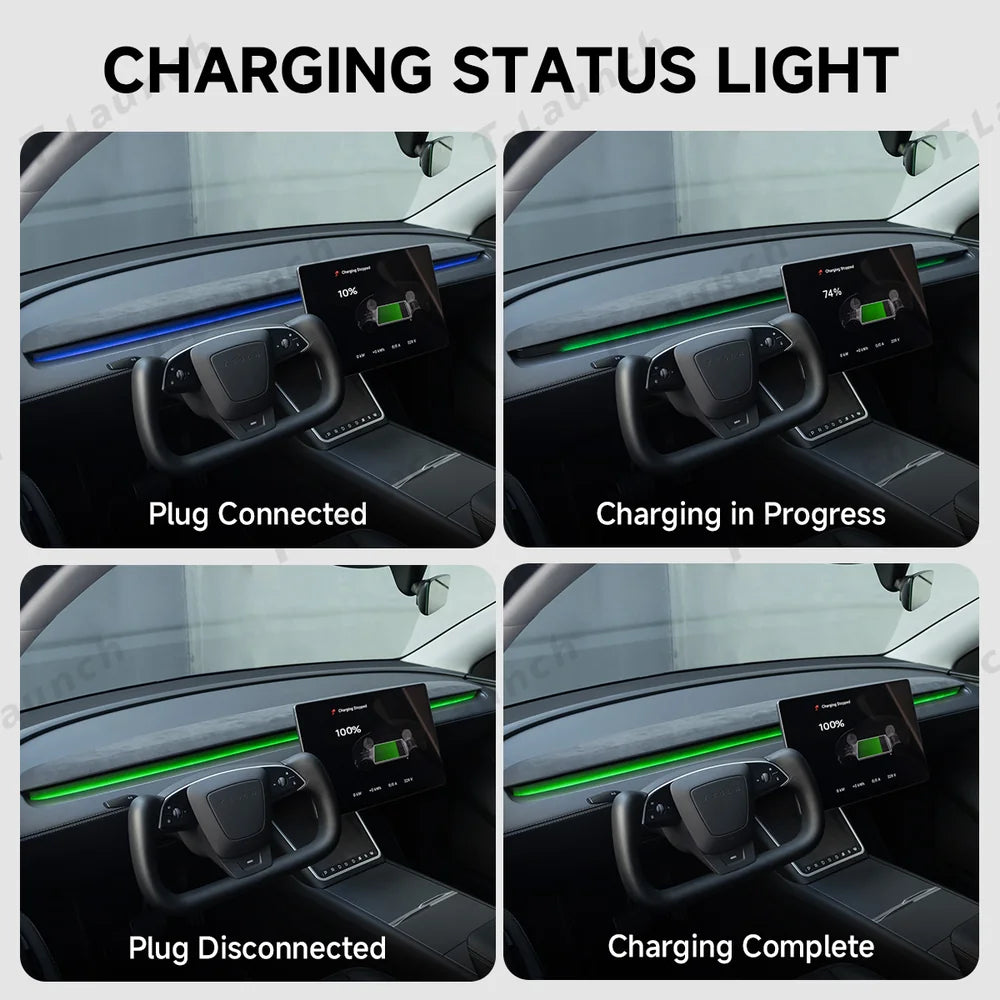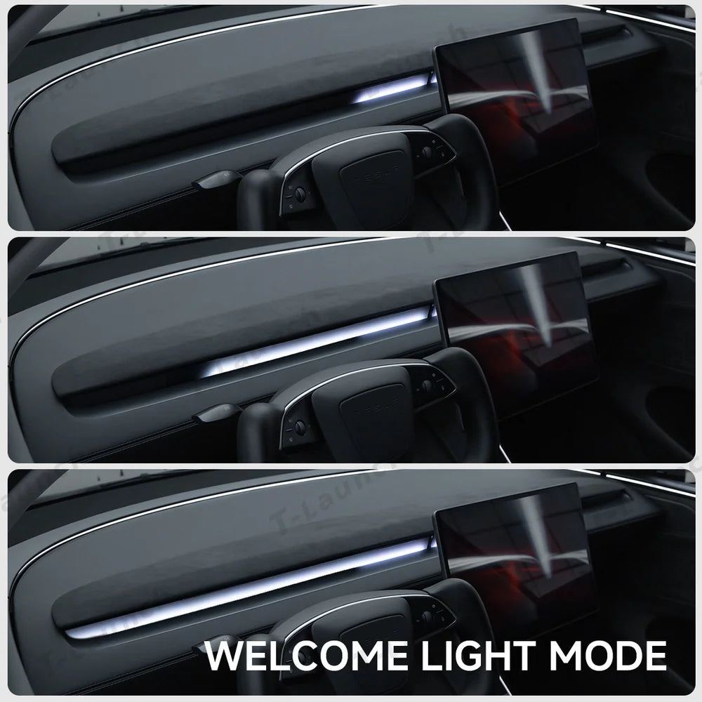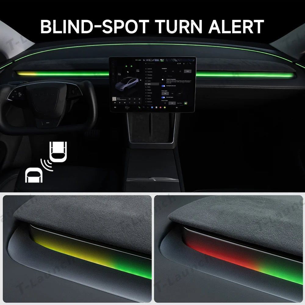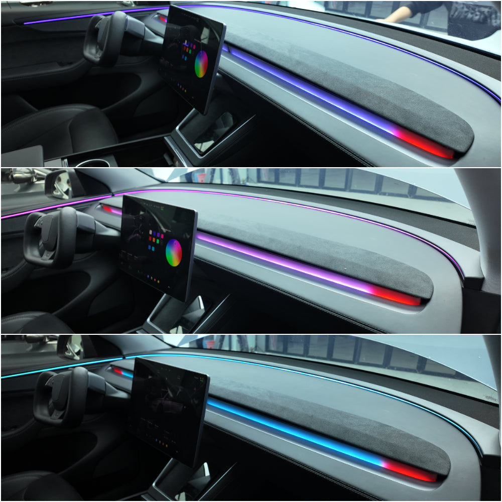 Enhance your driving experience with a smart ambient dashboard light bar designed for the Tesla Model Y Juniper / Model 3 Highland. It not only enhances cabin ambience but also delivers real-time driving information for safer trips. Flowing light effects and subtle visual cues make every drive more immersive and interactive. This adds a sense of sophistication while keeping important alerts easy to notice.